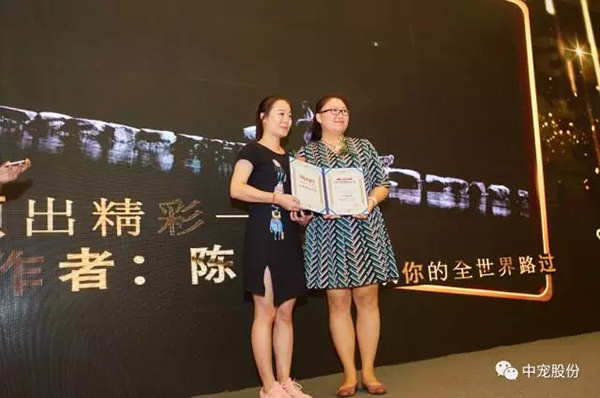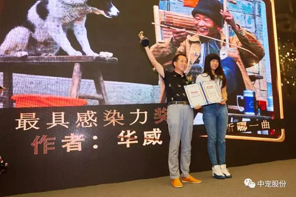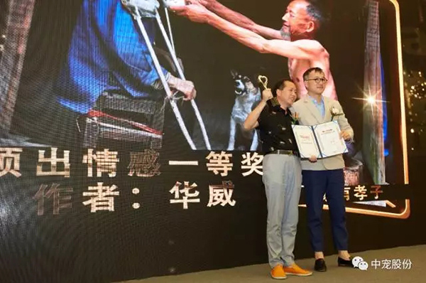 现场有一位获奖嘉宾,他扎根基层,拍摄的宠物虽没有名贵的品种,但是贴近生活,作品有着泥土的芳香。通过他的摄影作品,让人看到了摄影本身的美好,人性本真的友善和宠物天性的可爱,引发情感共鸣,现场颁奖嘉宾甚至留下激动的泪水,并表示“通过作品看到了人与宠物相依、相伴的感动,希望今后可以有更多人关注宠物,给予它们关怀与关爱!”中国礼仪休闲用品工业协会理事长曾会师女士、中宠股份董事长郝忠礼先生为特别大奖颁发证书。