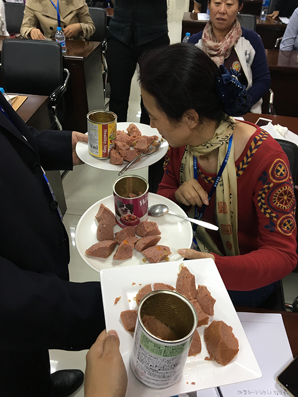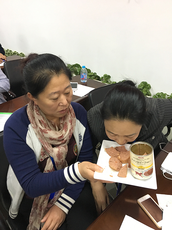 互动环节,中宠股份董事长郝总分别把日本代加工罐头与Wanpy国内销售罐头打开做对比,让观摩团成员真正看到、闻到、尝到中宠股份产品是真正的“全球共享 同一品质”。
