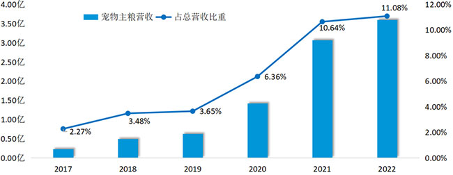 2017年~2022年,中宠股份旗下核心自主品牌产品结构不断优化,主粮销售表现抢眼。2017年主粮收入仅有2307万元,2020年首次破亿,达到1.42亿元,2022年主粮贡献销售额为3.6亿元。宠物主粮在中宠股份的营收比重也从2017年的2.27%,升至2022年的11.08%。