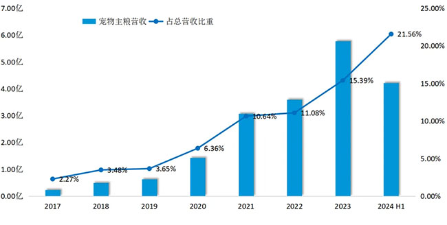 中宠股份2017~2024年上半年宠物主粮品类营收及占比情况