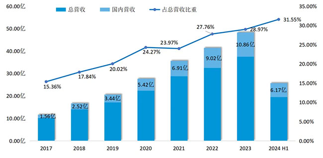 中宠股份2017~2024年上半年国内市场营收及占比情况