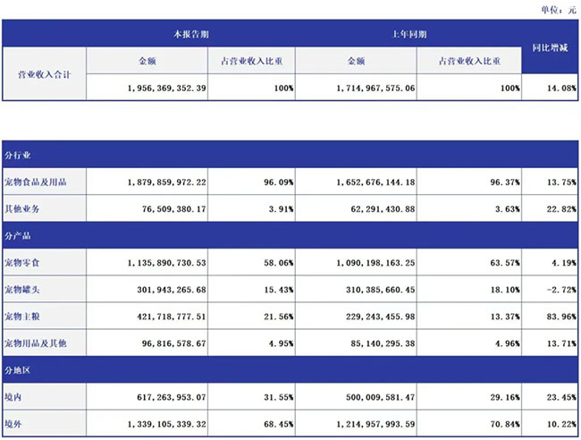 2024年8月19日,中宠股份发布2024年年中报。公司2024年上半年实现营业收入19.56亿元。其中,境内主营业务收入6.17亿元,同比增长23.45%,宠物主粮贡献销售额为4.22亿元,同比增长83.96%。整体业绩实现超预期大幅增长。