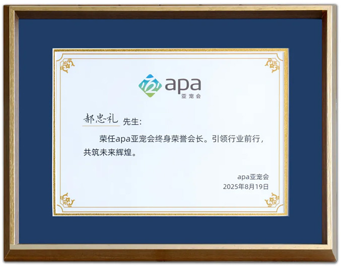 亚宠展启幕前夕,apa亚宠会换届大会暨第二届第一次理事会顺利召开。会上,中宠股份创始人、董事长郝忠礼先生被正式授予“apa亚宠会终身荣誉会长”职位,以表彰郝董作为apa亚宠会首任会长,在推动行业发展中作出的卓越贡献。会上郝董表示:“作为亚宠会首任会长,回望 2019 年,亚宠会从几个人的筹备起步,到一步步落地运营,六年来,每一位亚宠人始终坚守初心 —— 既要为全体会员单位做好服务,更要为中国宠物行业的健康、规范、高质量发展全力以赴。如今,当年播下的种子已茁壮成长,曾经的美好愿景正逐步照进现实,行业发展的‘果实’愈发丰硕。这一切,离不开所有中国宠业人的并肩奋斗,在此衷心感谢每一位同行者的付出。”此次“终身荣誉会长”职位的授予,既是对郝董作为首任会长、六年来带领亚宠会成长、坚守行业初心的肯定,也是对郝董深耕宠业、引领发展的高度认可。